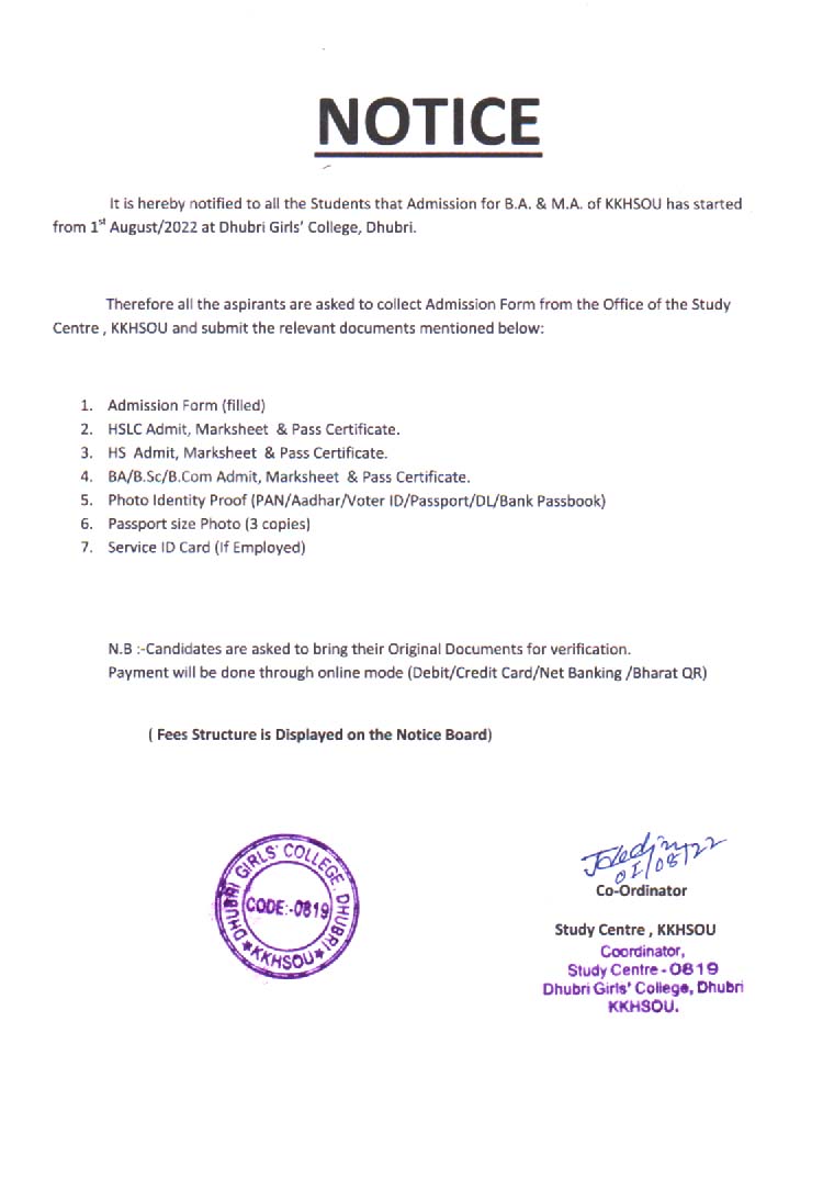Admission Notice for B.A, M.A for the session 2022-2023
