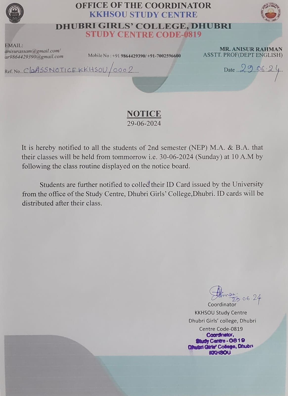 Notification for Assignment of B.A &M.A. (2nd Cycle). Last date for submission of assignments on or before 3rd Dec,2023